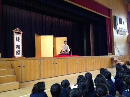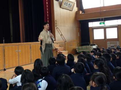 日吉小に桂春蝶(かつらしゅんちょう)さんをお招きし、子ども達は3時間目、講堂で落語を楽しみました。