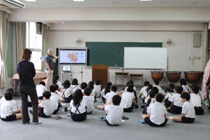 本校では毎週水曜日に、C−NET(大阪市英語指導員)のパトリック先生が来校し、担任と一緒に英語学習をします。対象児童は5・6年生で、隔月で行います。