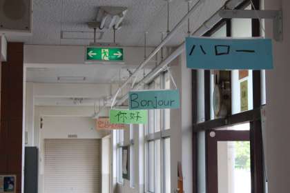 校舎1階廊下には、他国のあいさつを掲示しています。来校の際にはご覧になってください。