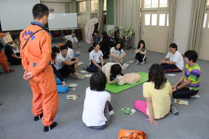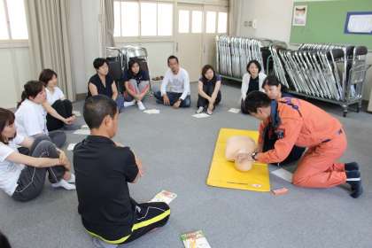 本日(14日)の放課後、本校教職員が普通救命講習を受講しました。西消防署の方々が講師となって、心肺蘇生法やAED使用法などについて学びました。