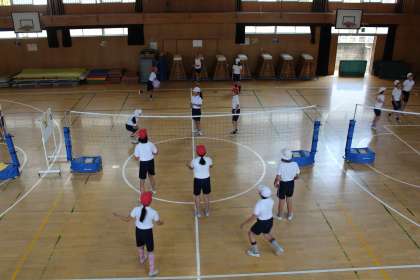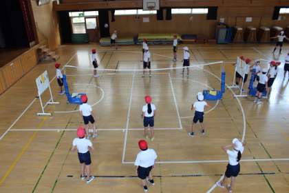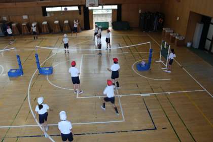 5年生が“キャッチバレーボール”に取り組んでいます。基本的なルールはバレーボールと同じですが、サーブはボールを投げる、レシーブとトスはボールをキャッチする、というのが大きな違いです。アタックはバレーボールと同じでボールを打ちます。