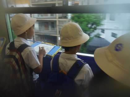 昨日(29日)、3年生が社会見学を行いました。JR環状線を一周した後、弁天町駅で下車し、ホテル大阪ベイタワーの51階から大阪市内を眺望しました。あべのハルカスや大阪城が見えて、子どもたちは嬉しそうでした。