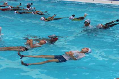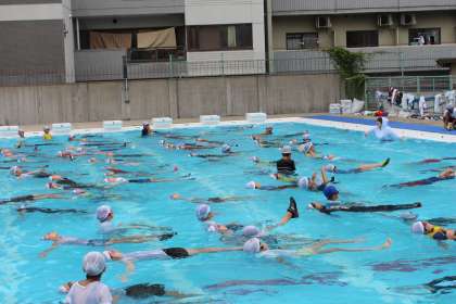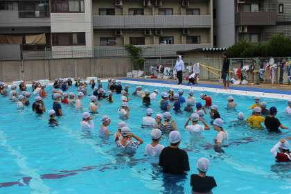 今日の2時間目に6年生が着衣泳をしました。万が一、水の事故にあった時の対処法を学びました。