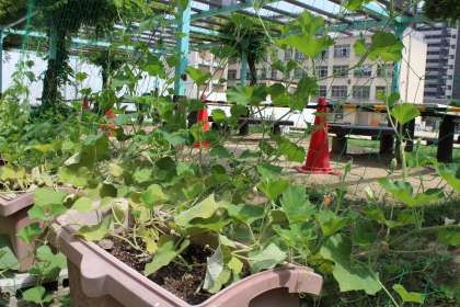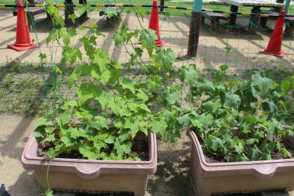 4年生がヘチマを栽培しています。本来の学習園ではなく、ツルを巻きつけるためのネットを設置しやすい藤棚下で育てています。