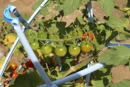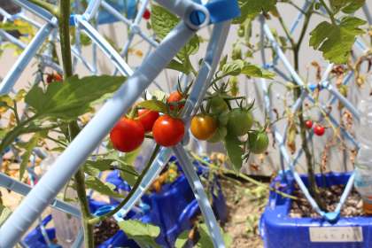 2年生が育てているミニトマトが赤い実をたくさんつけています。すでに収穫しているものもありますが、これから赤く熟しそうなものもまだたくさんあります。