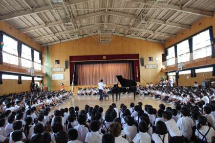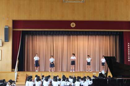 今朝の児童集会は、月に一度の音楽集会です。今回は学年ごとに整列し、全校で楽しく歌いました。