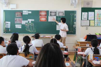 今日の2・3時間目、6年生3クラスが歯と口の健康教室を行いました。歯科衛生士さんが講師となり、歯周病などの病気や正しい歯みがきの仕方などを教えていただきました。