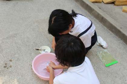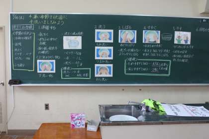 6年生が家庭科で洗濯実習を行いました。今回は手洗いで、もみ洗いとつまみ洗いです。節水しながら上手に洗っていましたが、洗濯物の水気をしぼるのには苦労していました。