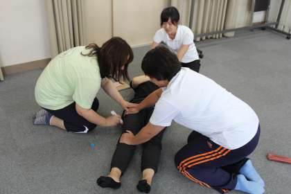 午前の防犯研修に続き、午後はアレルギー対応研修を行いました。食物アレルギーやハチ刺傷などによるアナフィラキシー症状が起きた時の処置について研修しました。