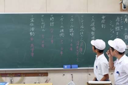 2時間目、各活動教室に集まり、6年生を中心に作りました。残りの時間は、役割分担や準備物の確認をしました。
