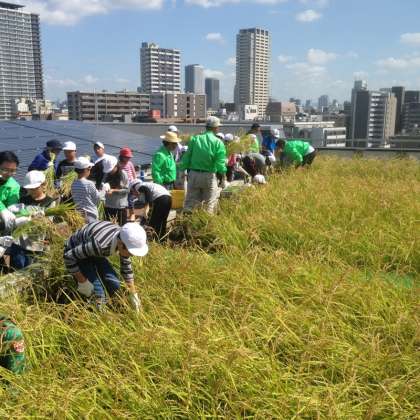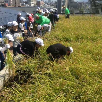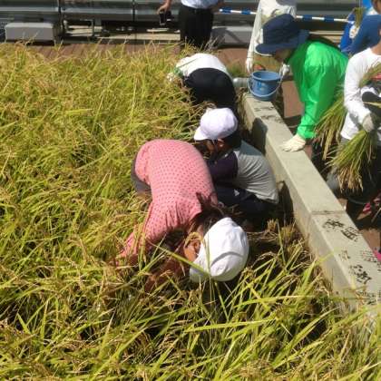 5年生が水田課外授業をハグ・ミュージアムで行っています。今回は稲刈り体験です。大きく育った稲を鎌で刈りとりました。