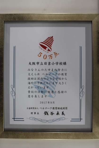 日吉小学校はベルマーク運動に取り組んでいますが、2017年8月、本校の集票累計点数が50万点を超えました。お礼として、写真のような感謝状をいただきました。