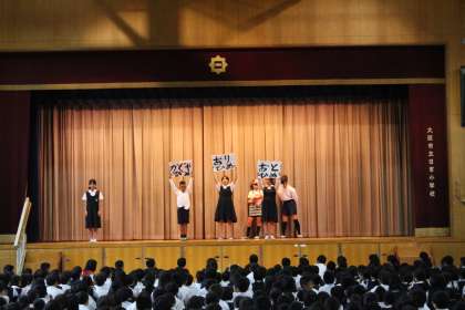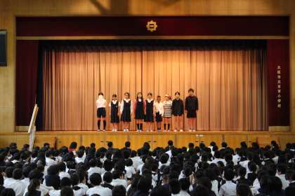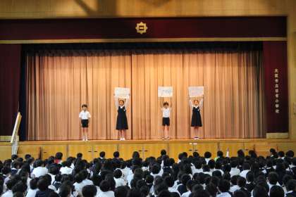 今朝の児童集会は、図書委員会の発表でした。物語の内容を劇で途中まで紹介して「続きは本で」と読書を促したり、教職員の子ども時代に読んだ本をクイズ形式で紹介したりしました。