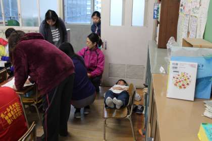 アナフィラキシーショックが起きた場合等を想定したアレルギー対応研修を行いました。全体研修で内容を確認した後、3つのグループに分かれて実践研修をしました。