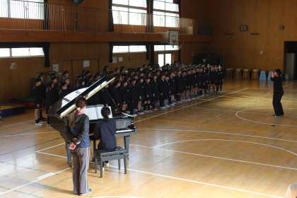 明日(28日)、5年生が音楽交流会へ行きます。そこで披露する歌を他学年の児童の前で歌いました。明日の本番も頑張ってほしいです。