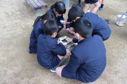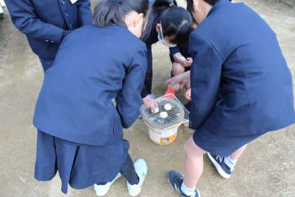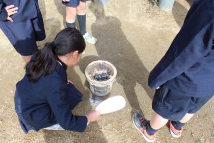 3年生が七輪体験をしました。七輪で炭をおこし、餅を焼いて、みんなで食べました。