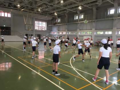 雨天のため、体育館で活動と昼食です。