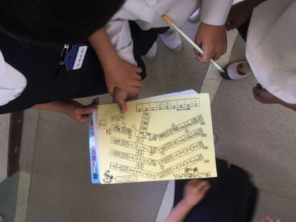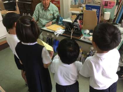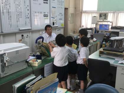 1年生がグループで学校探検をしました。職員室や管理作業員室、理科室や図書室などの特別教室を訪れ、いろいろな質問をしました。