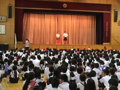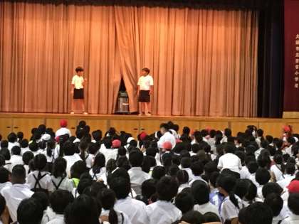 今日の全校集会は、カーテンの後ろに隠れているものを当てるクイズでした。
