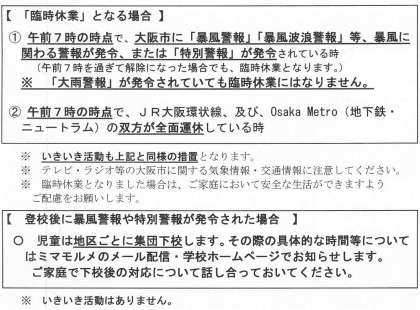 3日(火)に配布したプリントでお知らせしましたように、臨時休業となる場合は、以下の2点です。
