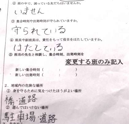 今日の5時間目に地域子ども会を行い、1学期の集団登校の様子について振り返りました。その後、集団下校しました。