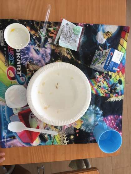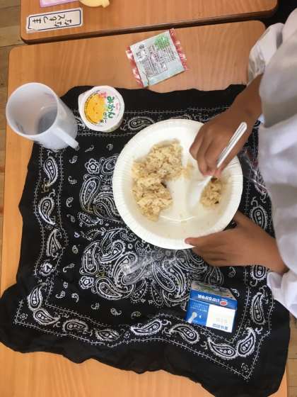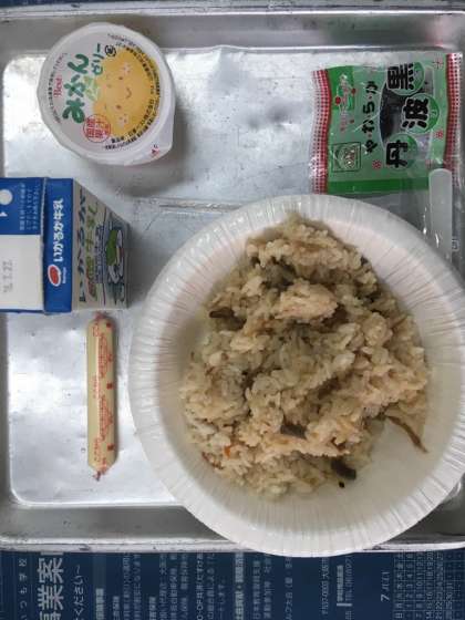 1学期の最後の給食は、かやくごはんでした。これまでの2日間のようなレトルトではなく、調理されたものでした。豆やチーズ、ゼリーもあり、美味しそうに食べていました。