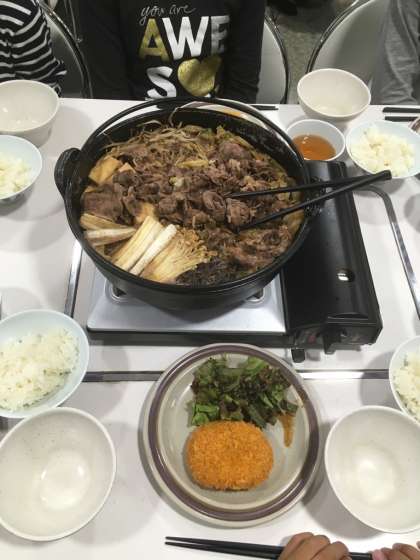 今日の夕食は、すき焼きとコロッケです。お腹も空いていたので、完食するグループもたくさんありました。