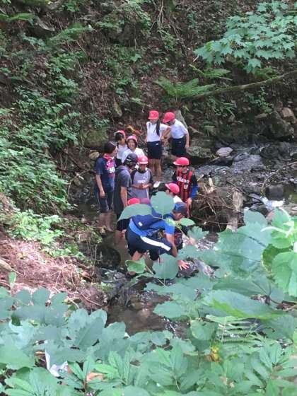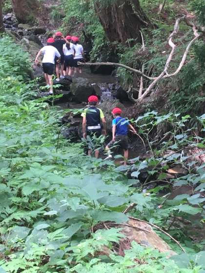沢のぼりです。沢を手と足を使ってのぼります。水が冷たくて気持ちよく、スリルもあって、2回チャレンジする子もいます。