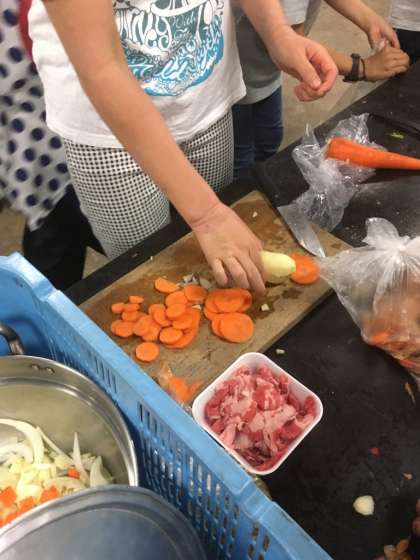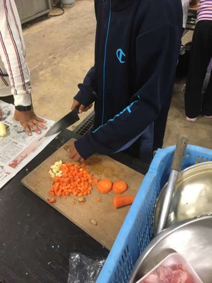 野外炊飯、カレー作りです。材料は、洗って細かく切っています。