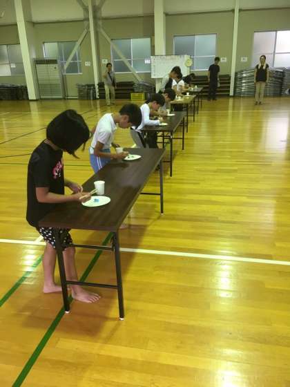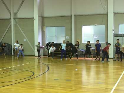 雨は上がりましたが、体育館でのリクレーション、ゴネンピックの開始です。チームに分かれて、いろいろなゲームで得点を競います。