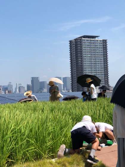 ハグミュージアムで、5年生が植えた稲の観察会があり、暑い中、子どもと保護者が参加しました。
