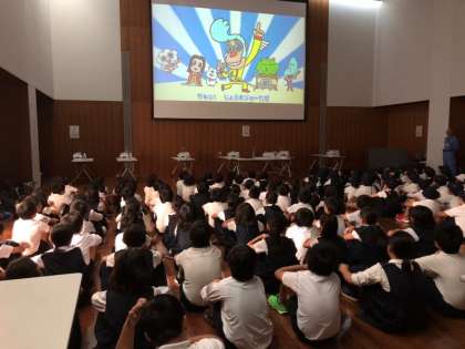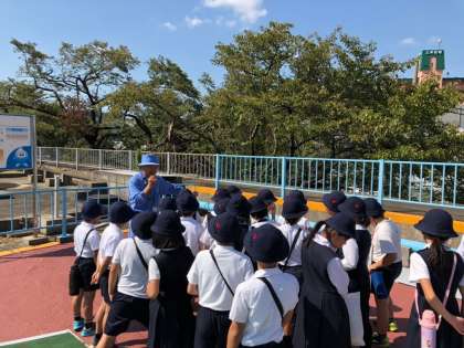 秋晴れの下、4年生が社会見学で、柴島浄水場へ行きました。