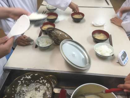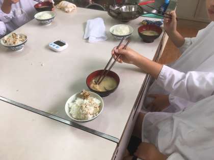 5年生が調理実習で、ごはんとみそ汁を作りました。