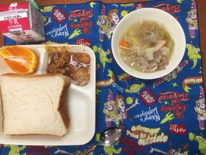 献立は、鶏肉のみそバターソース、スープ煮、デコポン、食パン、牛乳です。