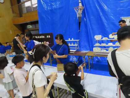 射的や輪投げ、ダーツなどのゲームやひも引きなどのクジ、焼きそばやポテト、かき氷やわたあめフランクフルトなどのお店の前では、長い行列ができているところもあります。講堂の中でもゲームコーナーがありました。
