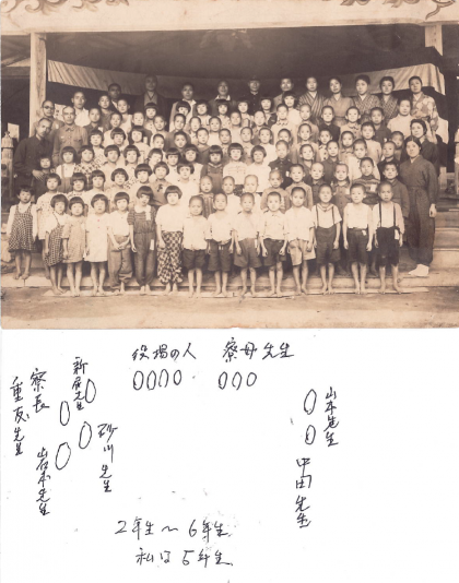 この写真は、島根県邑智郡都賀村にあった大阪市立日吉国民学校学童疎開寮の本部があった西円寺に、終戦直後の昭和20年9月22日、先生、寮母さん、学童が集まった時に撮影された一枚の写真です。