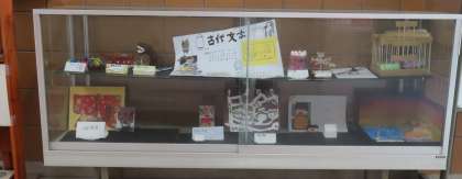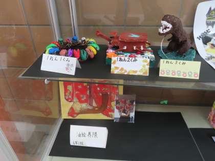 玄関にある作品棚に各学年の夏休みの作品が展示されています。