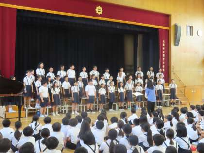 日吉の子どもたちの明るくのびのびとした姿が豊かな歌声となって表現されていました。歌い終わると講堂いっぱいに拍手が響き渡りました。「これからもコンクールに向けてがんばります!」とメンバーが決意を発表すると応援の拍手が送られました。