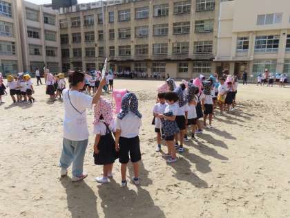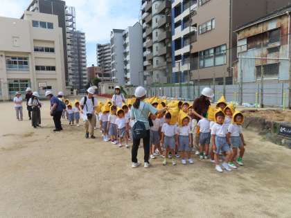 全員が防災頭巾をかぶり、「お(おさない)、は(はしらない)、し(しゃべらない)、も(もどらない)」の合言葉を守り移動しました。