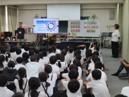 会場は多目的室です。5年生のみなさんは全員集中して静かにお話を聞いていました。