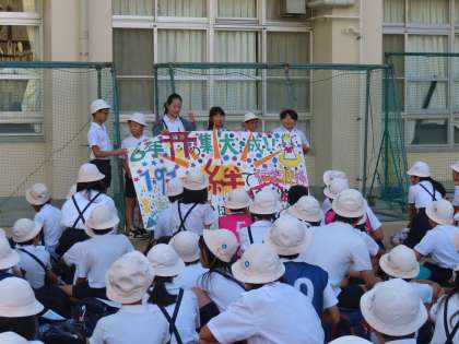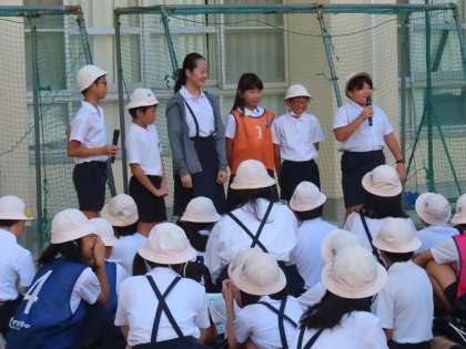 セレモニー係のみなさんがミニコントや自作の歌を交えて盛り上げながら進行をしてくれました。はじめに、修学旅行のめあてを全員で声をそろえて確認しました。係のみなさんのおかげで、すてきな出発式となりました。