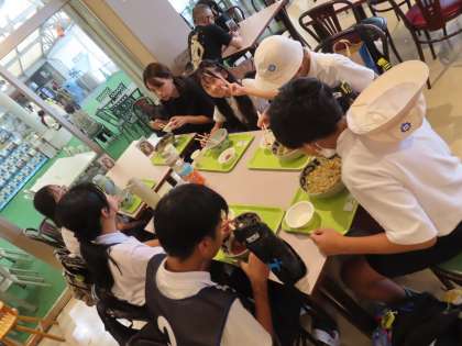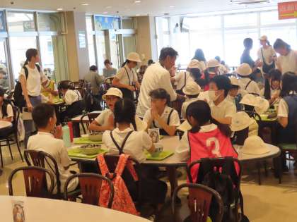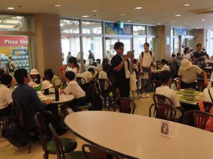 カレーとラーメンのセットが人気のようでした。中にはご当地の伊勢うどんを食べている人もいました。活動班ごとに「いただきます!」