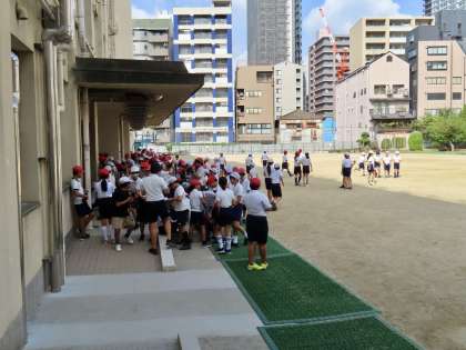 どの学年も練習の合間に水分補給の時間をとるようにしています。下の画像は5年生の給水タイムの様子です。