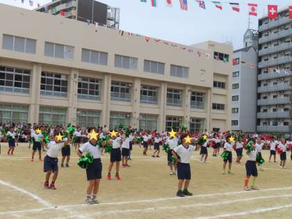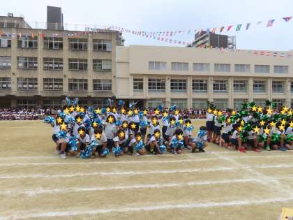 2年生の演技の様子です。カラフルなポンポンを手に全体、クラスごとにダンスを披露します。