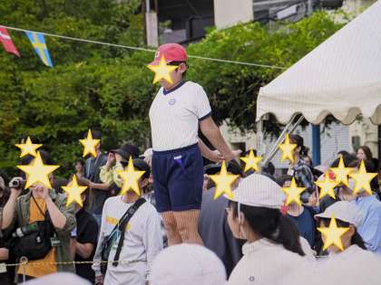 成績発表の後は、児童代表のみなさんが、ひよっぴーミャクミャクバージョンのお面をつけて、運動会のスローガンをもとにふりかえりのお話をしました(中)。