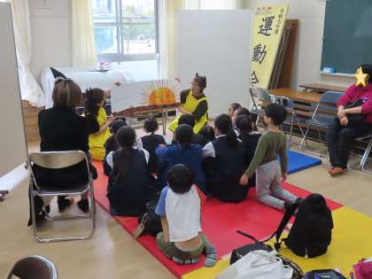 「おひさんの会」の皆さんによる読み聞かせのコーナーもあります。マットに座り、リラックスしながら絵本を楽しみました。