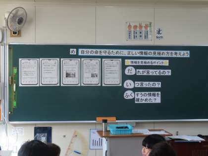 今日の授業では子どもたちが誤った情報から自分を守るために、情報を見極めるために情報の信頼性を判断する視点を学びました。