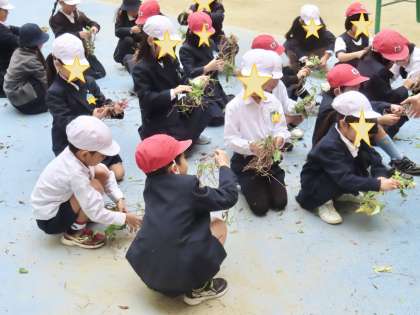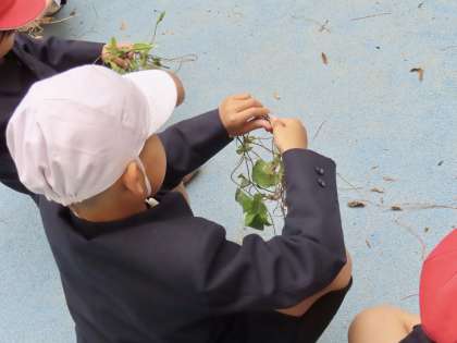 中庭で1年生がアサガオのつるでモール作りをしていました。