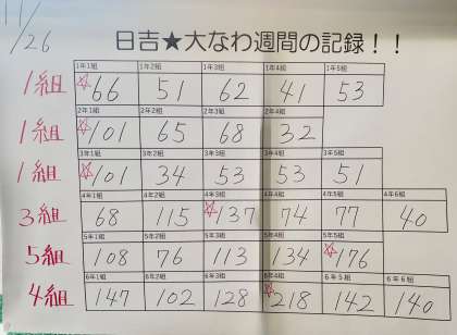 中の画像は各学年の跳べた回数の表です。各学年で1番多くの回数を跳べた学級の発表を放送でしていました(下)。