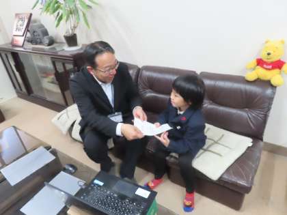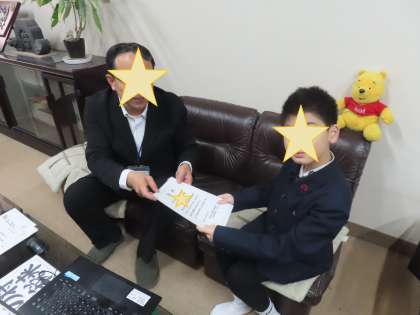 中は税に関する習字の優秀作品の表彰の様子です。作品もラミネートされて届きましたので、画面を通して全学年に紹介をしました。力強い筆運びで立派な作品ぞろいでした。